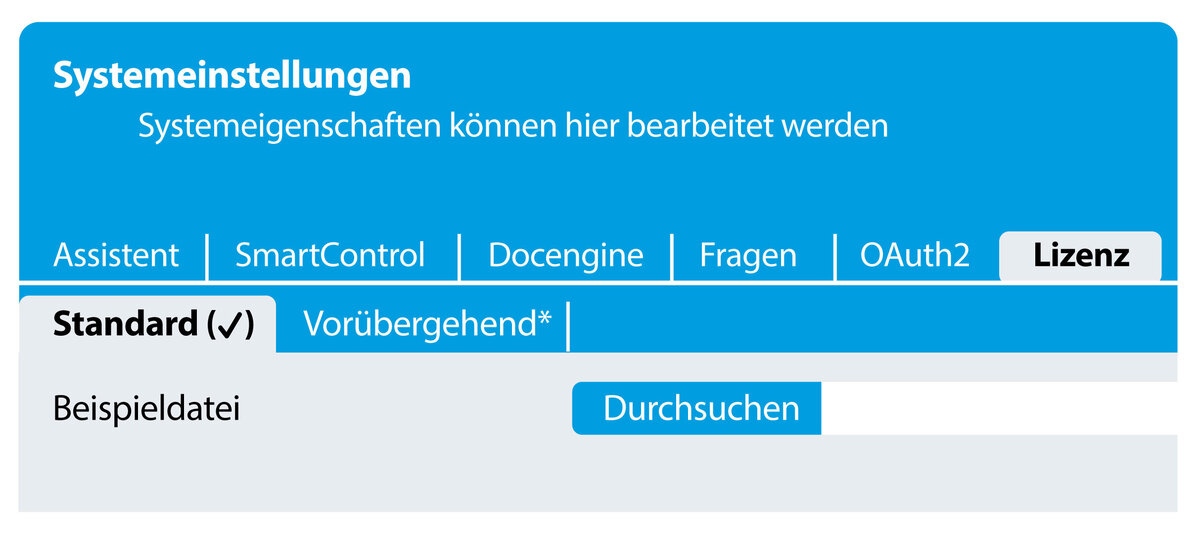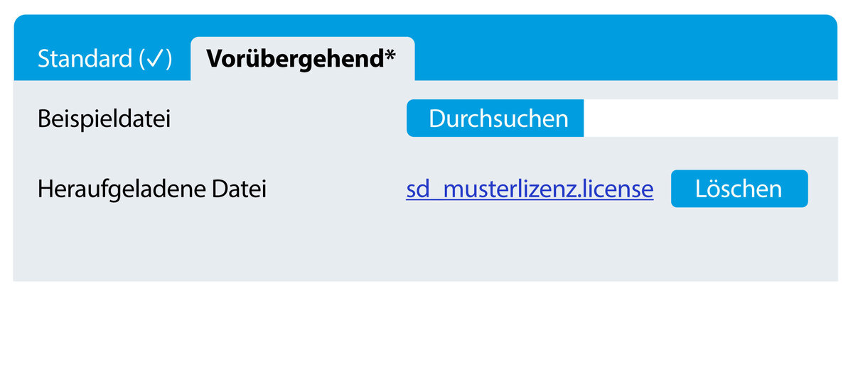 - Reiter „Standard“: Hier wird Ihre reguläre, jährlich ausgestellte Lizenzdatei hinterlegt und verwaltet.