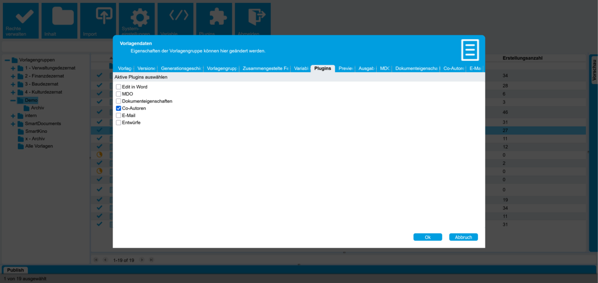 Innerhalb SmartControl kann unter dem Navigationspunkt "Plugins" festgelegt werden, auf welcher Ebene das "Co‑Authoring‑Modul" verfügbar ist. Die Funktion kann global ein‑ oder ausgeschaltet werden, sodass sie immer oder nie verfügbar ist. Logischer ist es jedoch, das Modul nur für bestimmte Ebenen zu aktivieren, wie zum Beispiel für bestimmte: