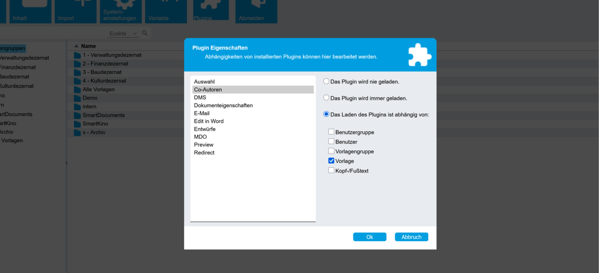 In den Eigenschaften jeder Vorlage gibt es einen Reiter „Plugins“. Dort können die aktivierten Module je Vorlage ein‑ oder ausgeschaltet werden.