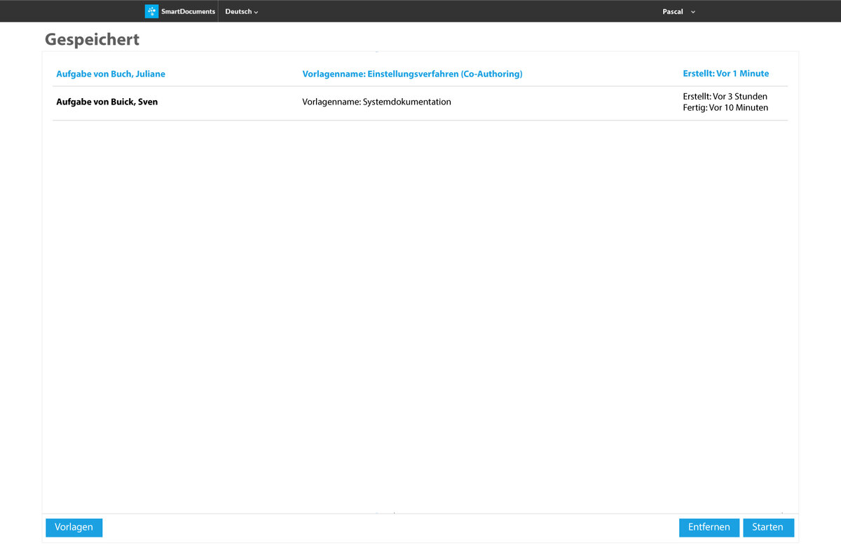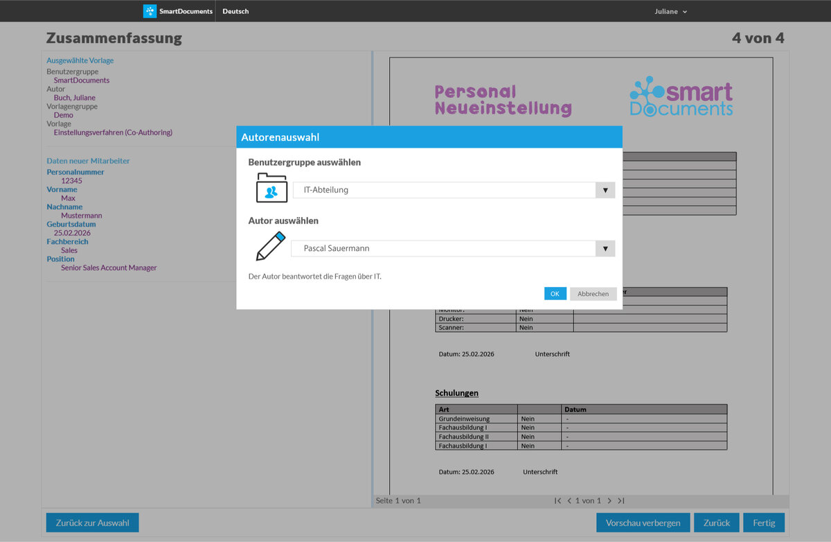 Nun wird auch Autor 3 per E-Mail über eine neue Aufgabe informiert. Autor 3 startet ebenso den SmartWizard, öffnet die neue Aufgabe und ergänzt auch seine relevanten Daten. Durch Klick auf "Fertig" wird jetzt das finale Dokument im gewünschten Format (PDF, Word, etc.) generiert, welches direkt an der richtigen Stelle (Dateisystem, DMS, Archiv, CRM, Fachverfahren, etc.) abgelegt oder natürlich auch per E-Mail an den richtigen Kollegen weitergeleitet werden kann.