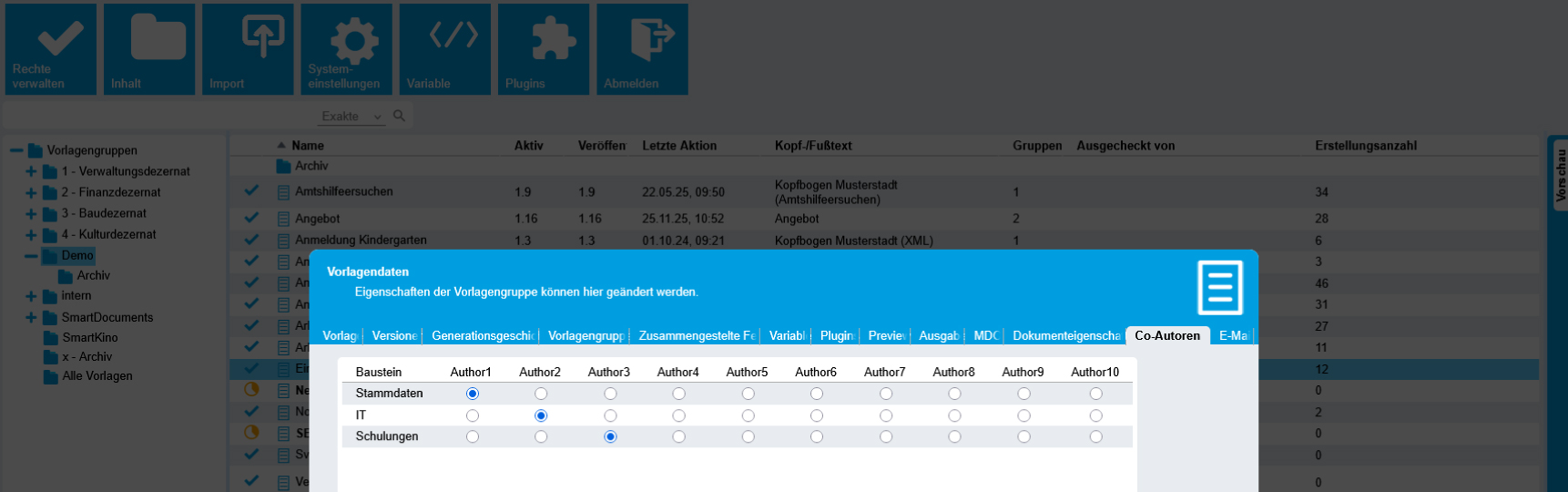 In unserem obigen Beispiel wäre das ein Baustein mit den "Stammdaten" für die Personalabteilung, ein Baustein "IT-Ausstattung" für die IT-Abteilung sowie ein Baustein "Schulungen" für die jeweilige Abteilungsleitung. Wurde der Vorlage (wie im Punkt Vorbereitungen beschrieben) das Co-Authoring zugewiesen, finden Sie in den Eigenschaften der Vorlage den Reiter "Co-Autoren". In diesem legen Sie nun fest, welcher Autor, welchen Baustein bzw. welche Bausteine bearbeiten muss.