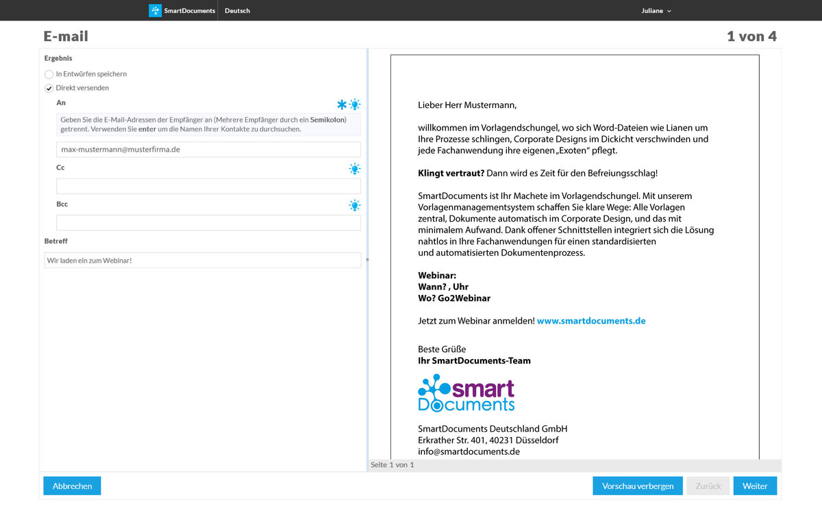 - Versand als E-Mail-Text: Das Dokument, das der SmartWizard generiert, wird im Anschluss als E-Mail-Text versendet.