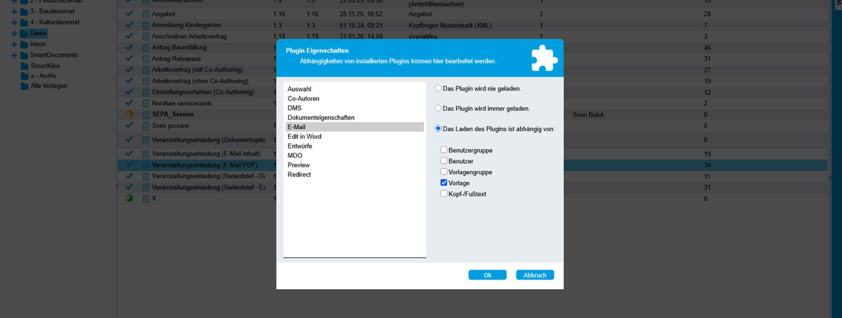 Unter dem SmartControl-Navigationspunkt "Plugins" - "E-Mail" wird daraufhin festgelegt, auf welcher Ebene das E-Mail-Plugin verfügbar ist. Das Plugin kann hier aktiviert und deaktiviert werden, sodass die Funktion immer oder nie verfügbar ist. Es ist jedoch sinnvoller, das E-Mail-Plugin nur auf einer bestimmten Ebene zu aktivieren. Zum Beispiel, indem Sie eine separate Vorlagengruppe mit allen E-Mail-Vorlagen verwenden und das Plugin auf Ebene der Vorlagengruppe oder generell auf Vorlagenebene aktivieren.