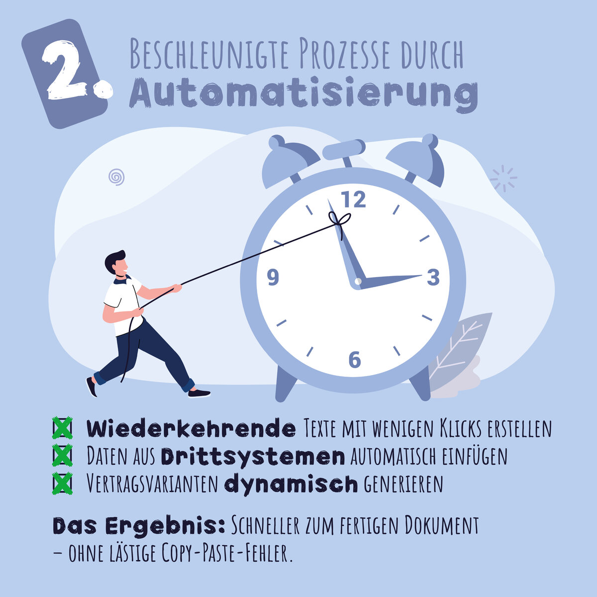 So lässt sich die Balance zwischen Qualität, Geschwindigkeit und Compliance wiederherstellen. Wenn juristische Teams nicht mehr stundenlang Formulierungen abgleichen oder veraltete Klauseln korrigieren müssen, bleibt Zeit für das, was wirklich zählt: fundierte Rechtsberatung, Mandantenbetreuung, strategische Aufgaben oder auch die inhaltliche Bewertung komplexer Fälle. Die Entlastung im administrativen Bereich führt zu höherer Qualität im fachlichen Bereich – ein Vorteil für Mitarbeiter:innen, Mandanten und die gesamte Organisation.