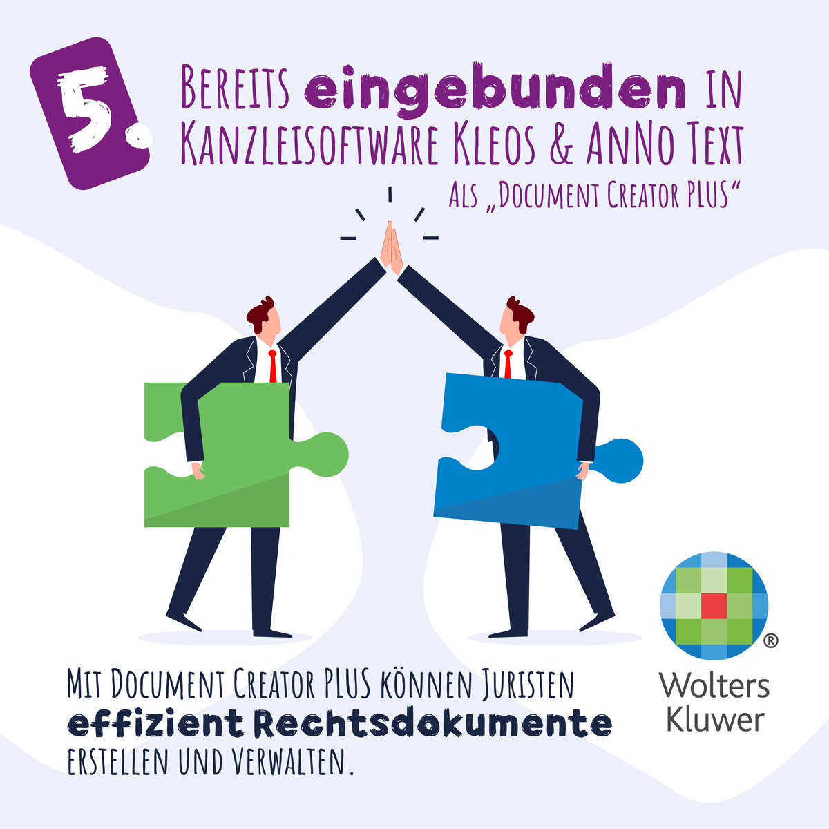 Seit vielen Jahren arbeiten wir eng mit der Wolters Kluwer Legal Software Deutschland GmbH zusammen, um innovative Lösungen für die juristische Dokumentenerstellung zu entwickeln. Im Rahmen dieser Partnerschaft wurde das Vorlagenmanagementsystem SmartDocuments in die Kanzleisoftware Kleos sowie AnNo Text integriert. Was einst unter dem Namen "Legal SmartDocuments" begann, wurde konsequent weiterentwickelt und trägt heute den Namen "Document Creator PLUS" – ein Ausdruck unserer gemeinsamen Vision für moderne, intelligente Kanzleisoftware.